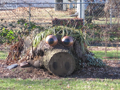 The winter sun was not the only thing that drew me out into the garden today. I looked out to see that the winds of the past couple of days did a little rearrangeing of some garden ornaments. This is a bad thing. It is the first time that wind has ever knocked over the bird cage. It is very heavy and with it being made of wire the wind usually just flows through. I guess the cage then knocked over the huge concrete basket planter. Geez, it took all of my strength to set that concrete basket back up on its pedestal. There are minature hostas planted in this planter. They have survived the past few years in this very spot. I hope the toppling of their planter doesn't disturb the roots to make them not be able to survive the winter. We will have to wait to see.