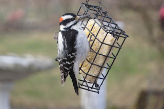 While a Hairy Woodpecker feasted on the suet. This is one tough woodpecker. He wasn't about to share with other birds. You can tell he is a male due to the red patch at the back of his head. You can tell him from a Downy Woodpecker first by his size. Look at that bill it is almost as long has his head is wide and it is thicker. A Downy also has little spots on the outer tail feathers.